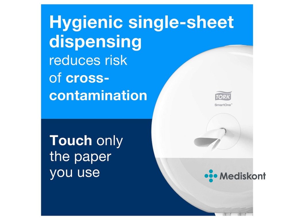 Tork SmartOne mini toaletní papír v roli je jedinečný systém, který nabízí pokaždé jeden hygienický útržek a v porovnání s tradičními zásobníky na jumbo role snižuje spotřebu až o 40 %. Každá role tak vystačí pro více návštěvníků. Tork SmartOne mini role s vysokou kapacitou jsou vhodné do náročných podmínek toalet a umýváren bez ohledu na jejich návštěvnost.