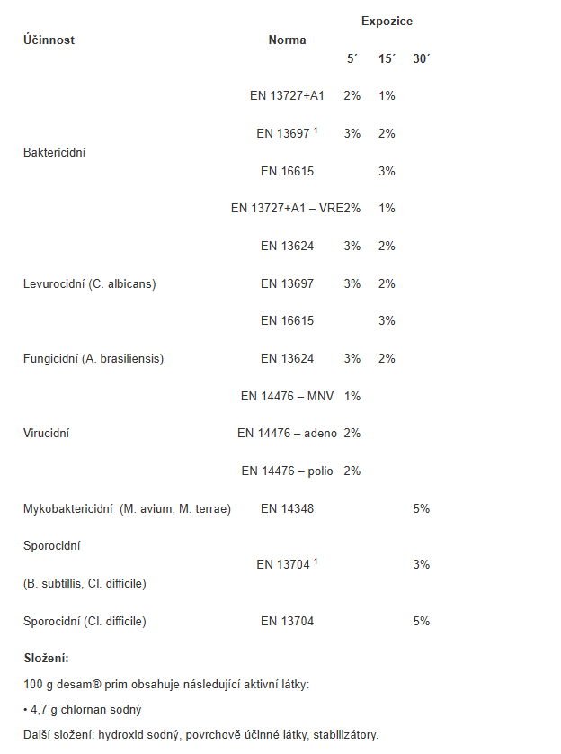 Pracovní roztok si připravte bezprostředně před použitím, naředěním desam®u prim vodou (max. do 30 °C). Koncentraci pracovního roztoku si zvolte dle požadovaných parametrů na biocidní účinnost.