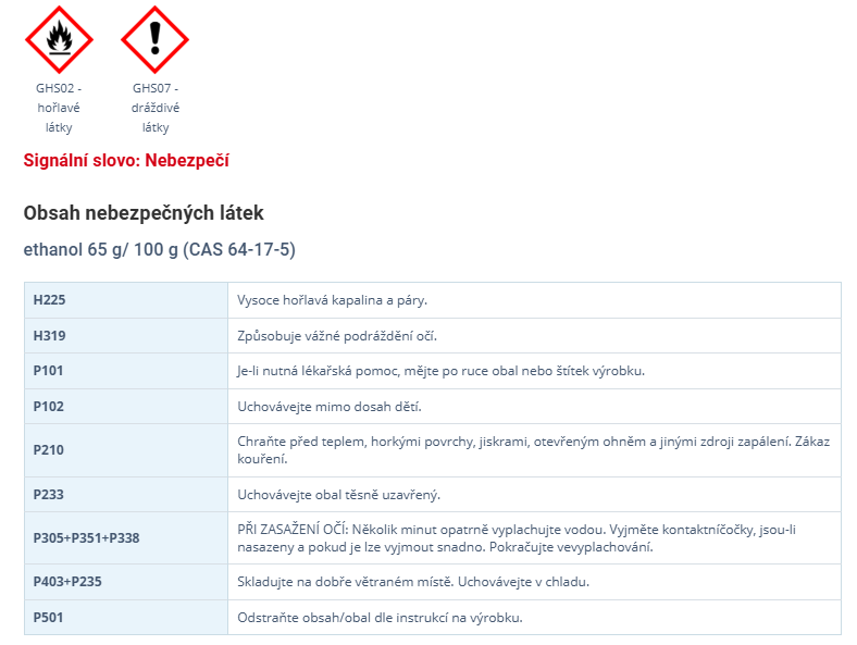ethanol 65 g/ 100 g (CAS 64-17-5). Používejte biocidy bezpečným způsobem. Před použitím si vždy přečtěte etiketu a informace o přípravku. Zákaz opakovaného použití obalu!