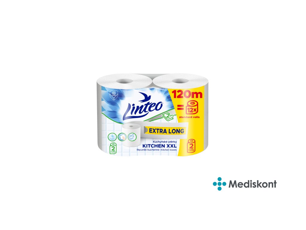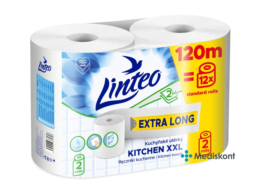 Dvouvrstvé bílé papírové kuchyňské utěrky Linteo XXL jsou nepostradatelným pomocníkem při každodenním vaření i úklidu. Díky dlouhému návinu – 60 metrů v jedné roli – vydrží mnohem déle než běžné kuchyňské utěrky. Vyrobeny ze 100% celulózy jsou pevné, savé a bezpečné pro kontakt s potravinami. Praktické balení obsahuje 2 role, každá s návinem 60 metrů.