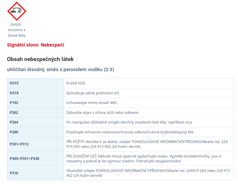 peroxid vodíku; benzensulfonová kyselina, C10-13-alkylderiváty, sodné soli; alkoholy, C12-14, ethoxylované. Způsobuje vážné poškození očí.