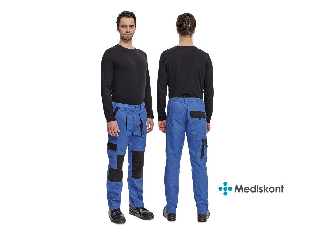 pánské pracovní kalhoty s elastickým pasem; 2 přední kapsy, 1 stehenní kapsa, 2 zadní kapsy; zesílená oblast kolen; nastavitelná délka nohavic