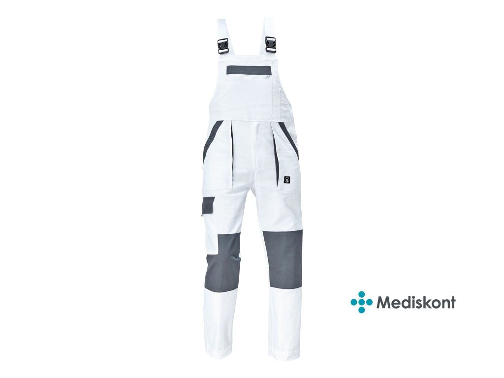 Pánské pracovní kalhoty s laclem a elastickým pasem; široké šle s plastovými sponami; 2 přední kapsy, 1 stehenní kapsa; 1 velká náprsní kapsa, 2 zadní kapsy; zesílená oblast kolen; nastavitelná délka nohavic.